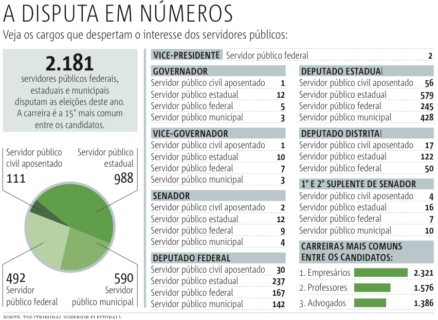 O privilégio que abre brechas a fraudes é respaldado na lei. Para dar isonomia de condições, evitando a concorrência desleal, ocupantes de cargos públicos federal, estadual e municipal, além dos militares, têm direito a licença remunerada de 90 dias. O salário é pago integralmente. O prazo é contado a partir da aprovação do candidato na convenção partidária até 10 dias após as eleições. A única desvantagem é que a licença não conta como tempo de serviço e os ocupantes de cargos de chefia precisam se desligar da função. Nas empresas privadas, os empregados conseguem sair pelo mesmo período, mas ficam com a remuneração suspensa. …